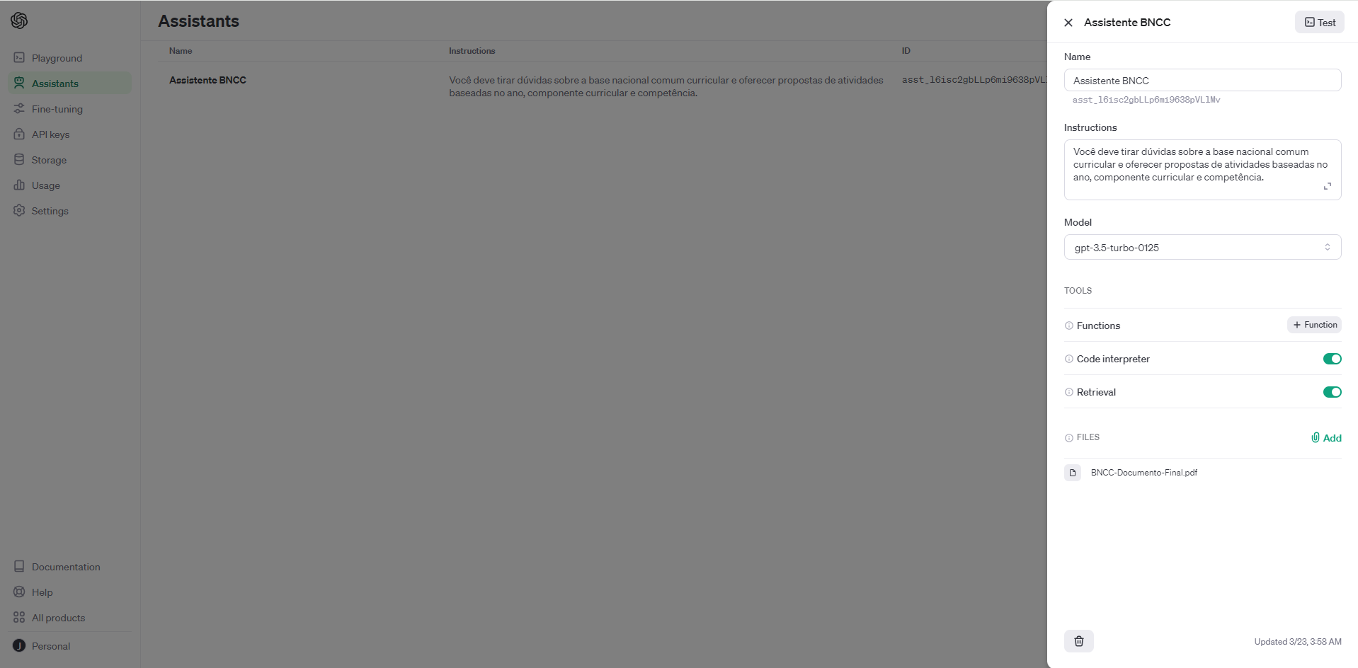 3 - Preencha o nome do assistente e sua instrução. Aqui vamos usar "Você deve tirar dúvidas sobre a base nacional comum curricular e oferecer propostas de atividades baseadas no ano, componente curricular e competência.".