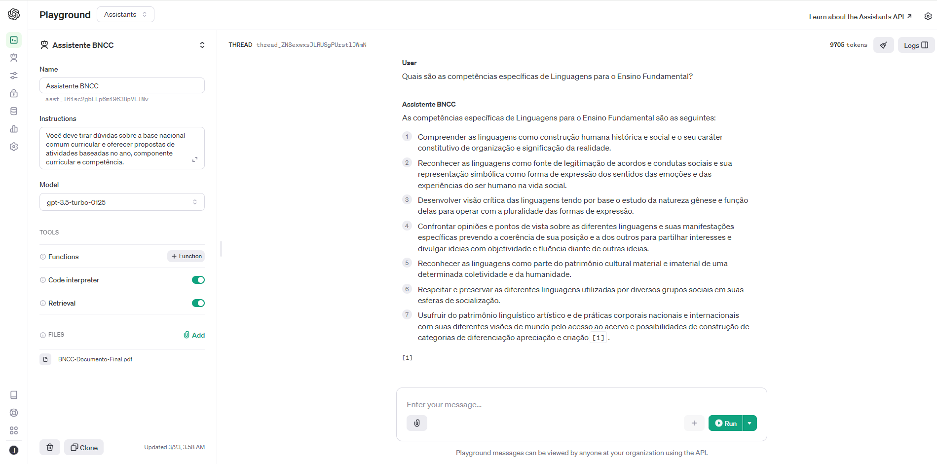 7 - No campo de mensagem, escreva uma pergunta sobre a BNCC, por exemplo "Quais são as competências específicas de Linguagens para o Ensino Fundamental?" e clique em "Run"